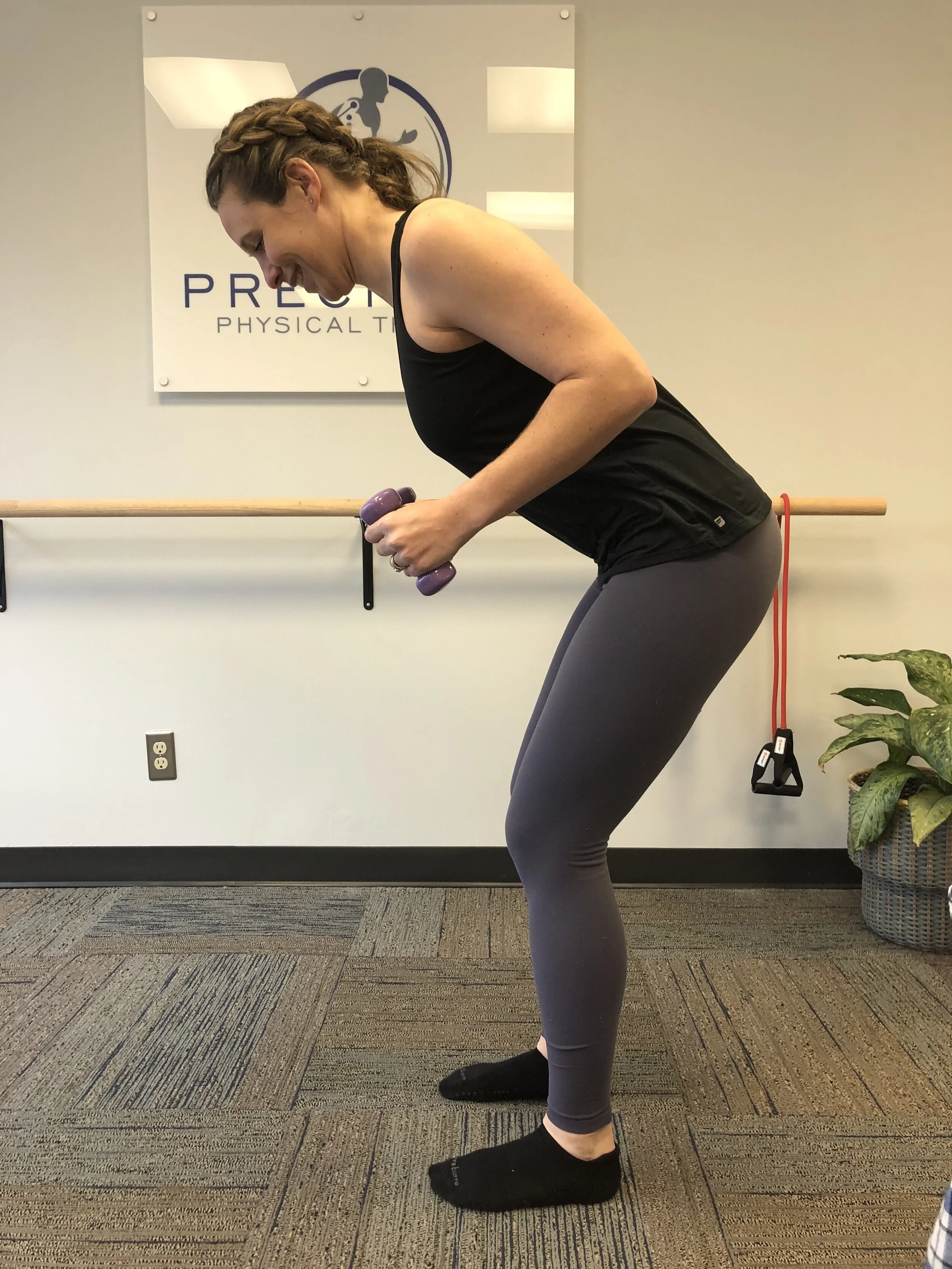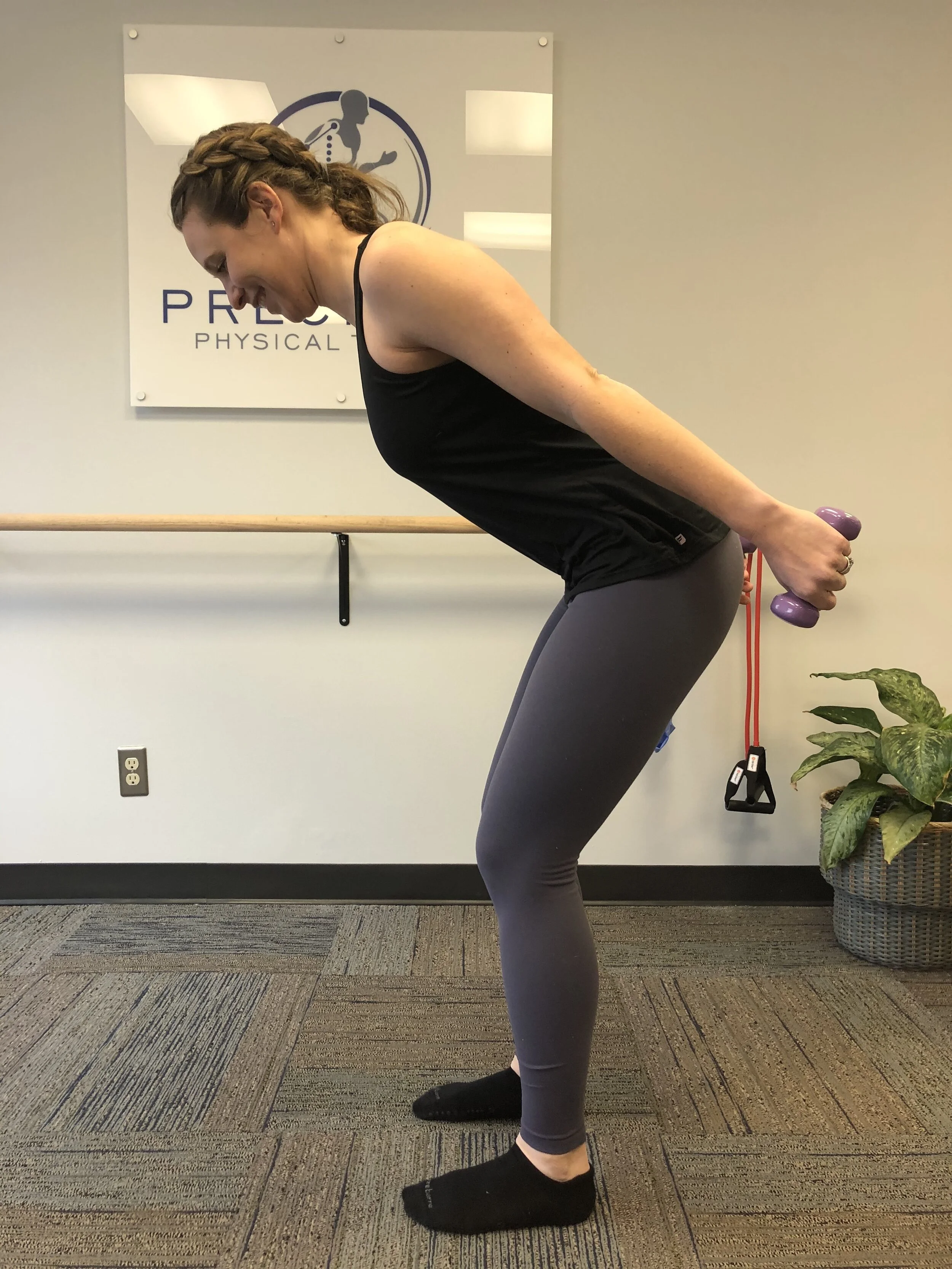 During a hip hinge, the goal is to keep your back flat and sit your hips back. When you are in this posture the gluteals (buttock muscles) should contract to help you sustain the forward bend position. When the gluteals do not contract we tend to over use our hamstrings (back of the thigh) and back muscles. In physical therapy, being able to find (or contract) your gluteals during a hip hinge is an important component in treating many back pain conditions.